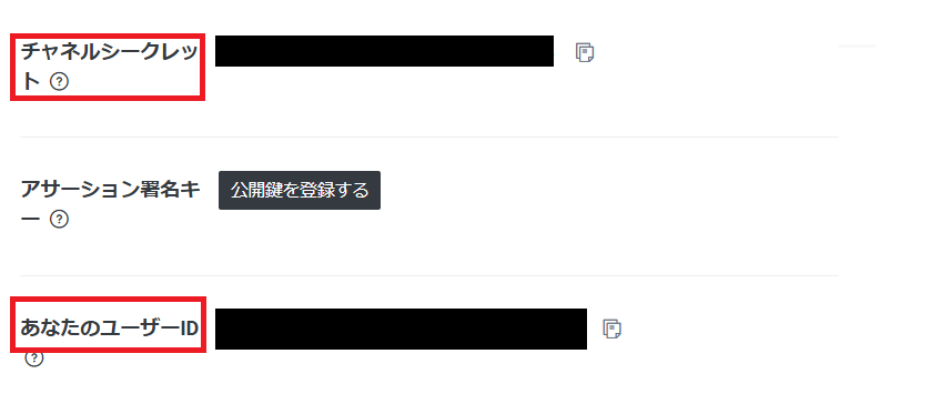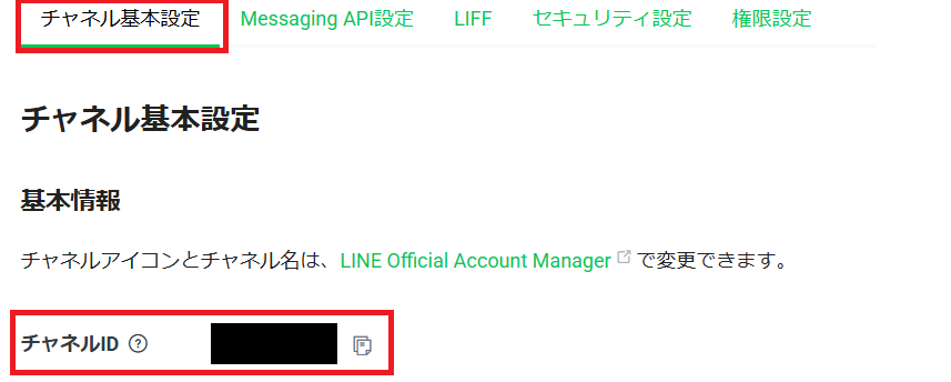 MessageAPIを利用するために必要な「チャネルID」「チャネルシークレット」を確認しメモしておきます。「LINE Developers」にログインし、チャネルの設定で確認できます。