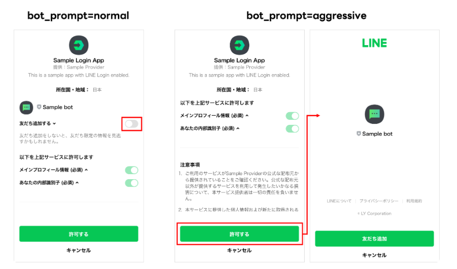 | bot_prompt | LINE公式アカウントを友だち追加するオプションをユーザーのログイン時に表示します。 | normalまたはaggressiveを指定します。詳しくは、「LINEログインしたときにLINE公式アカウントを友だち追加する(友だち追加オプション)」を参照してください。 |